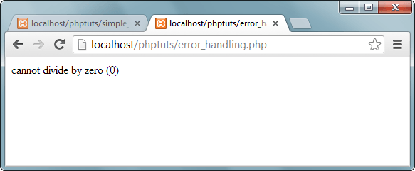 ?>Open the URL http://localhost/phptuts/exception_handling.php You will get the following results.