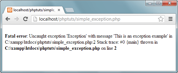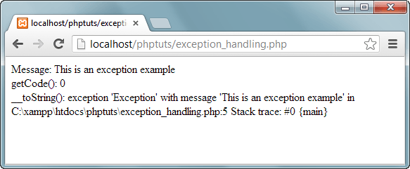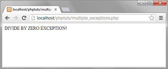 Browse to the URL http://localhost/phptuts/multiple_exceptions.php.