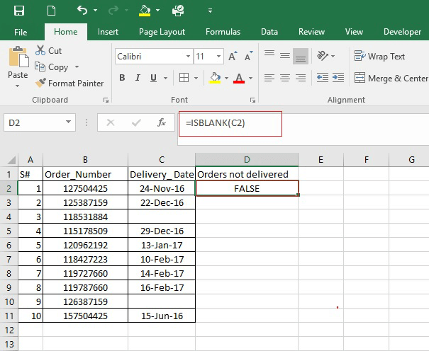 And the value returned as 'FALSE' since the delivery date is given which is a non-empty cell. You apply the same formula for the rest of the cells. For the order '118531884' delivery date is not given and the formula returns the result as 'TRUE.'