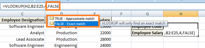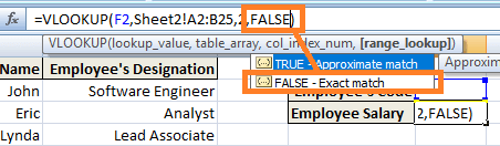 Step 6) Argument 4: Last Argument refers to the Exact Matches (FALSE) or Approximate Matches (TRUE). In this instance, we want to retrieve the exact matches for the Employee's Salary.