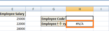 Step 7) Press 'Enter' to notify the cell that we have completed the function. However, you get an error message as below because no value has been entered in the cell H2i.e. No employee code has been entered in Employee Code which will allow the value for lookup.