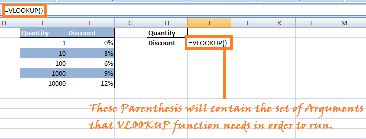 Step 2) Enter '=VLOOKUP()' in the cell. In the parenthesis enter the set of Arguments for the above instance.