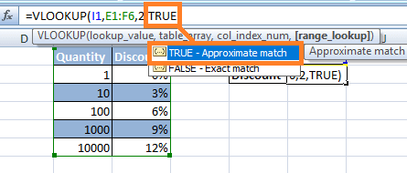 NOTE: If you want to use TRUE as the last parameter, you can leave it blank and by default it chooses TRUE for Approximate Matches.