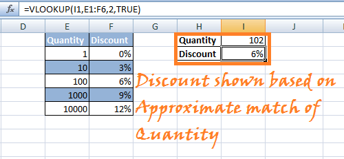 Step 6) Press 'Enter.' Vlookup formula will be applied to the mentioned Cell reference, and when you enter any number in the quantity field, it will show you the discount imposed based on Approximate Matches in VLOOKUP.