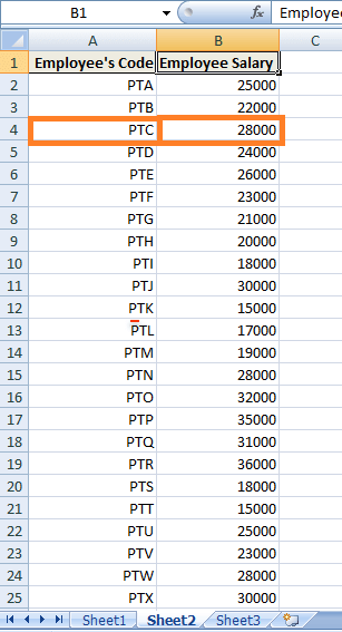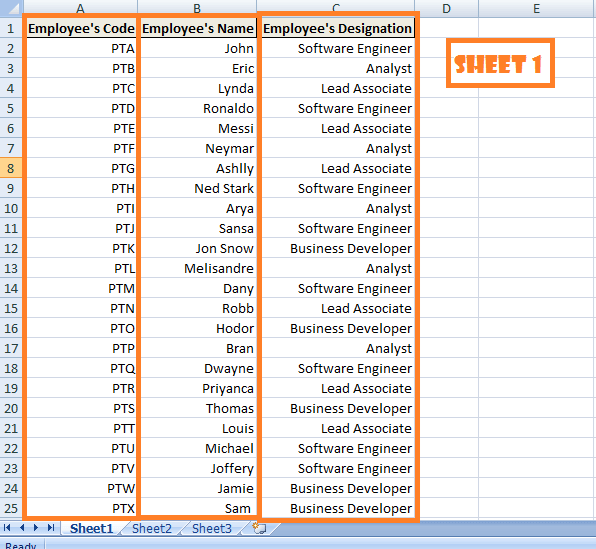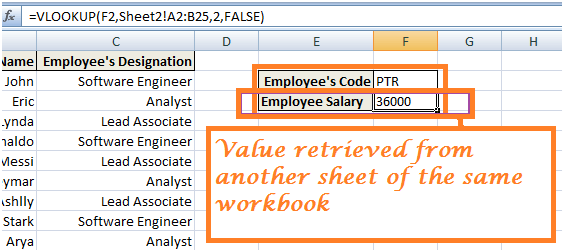 Let's see an instance similar to the above case scenario. We are provided with one workbook containing two different sheets. One where Employee's Code along with Employee's Name and Employee's Designation is given another sheet contains Employee's Code and respective Employee's Salary (as shown below).
