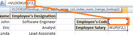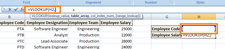 Step 3) First Argument: the first argument would be the cell reference (as the placeholder) for the value that needs to be searched or the lookup value. Lookup value refers to the data which is already available or data which you know. (In this case, Employee Code is considered as the lookup value so that the first argument will be H2, i.e., the value which needs to be looked up or searched, will be present on the cell reference 'H2').