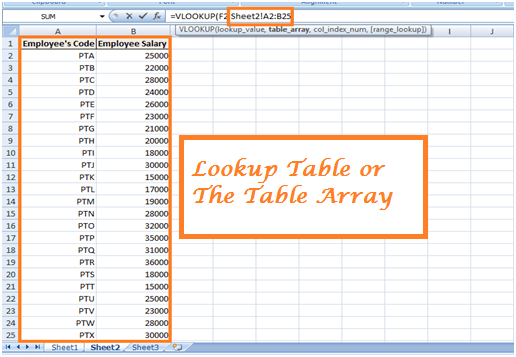 Step 4) Argument 2: In the second argument, we enter the lookup table or the table array. However, in this instance, we have the lookup table situated in another sheet in the same workbook. Therefore, for building a relationship we need to enter address of the lookup table as Sheet2!A2:B25 – (A2:B25 refers to the lookup table in sheet 2)