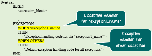 BEGIN <execution block> . . EXCEPTION WHEN <exceptionl_name> THEN <Exception handling code for the “exception 1 _name’' > WHEN OTHERS THEN <Default exception handling code for all exceptions > END;