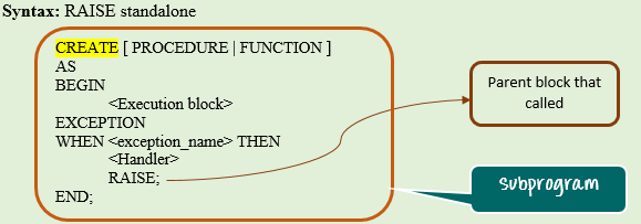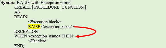 CREATE [ PROCEDURE | FUNCTION ] AS BEGIN <Execution block> RAISE <exception_name> EXCEPTION WHEN <exception_name> THEN <Handler> END;