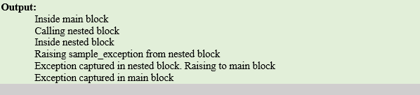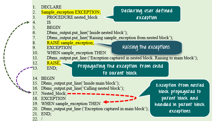 DECLARE Sample_exception EXCEPTION; PROCEDURE nested_block IS BEGIN Dbms_output.put_line(‘Inside nested block’); Dbms_output.put_line(‘Raising sample_exception from nested block’); RAISE sample_exception; EXCEPTION WHEN sample_exception THEN Dbms_output.put_line (‘Exception captured in nested block. Raising to main block’); RAISE, END; BEGIN Dbms_output.put_line(‘Inside main block’); Dbms_output.put_line(‘Calling nested block’); Nested_block; EXCEPTION WHEN sample_exception THEN Dbms_output.put_line (‘Exception captured in main block'); END: /