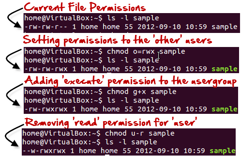 We can use the 'chmod' command which stands for 'change mode'. Using the command, we can set permissions (read, write, execute) on a file/directory for the owner, group and the world. Syntax: