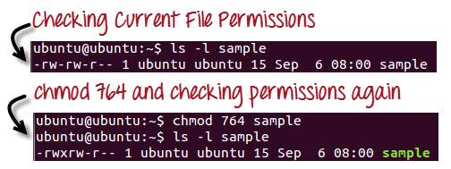 In the above-given terminal window, we have changed the permissions of the file 'sample to '764'.