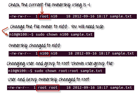 In case you want to change the user as well as group for a file or directory use the command