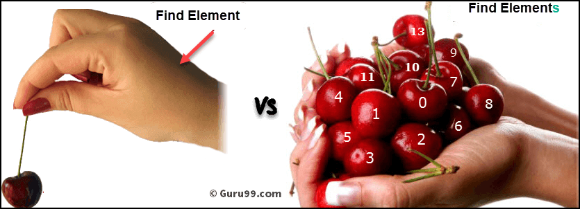 Interaction with a web page requires a user to locate the web element. Find Element command is used to uniquely identify a (one) web element within the web page. Whereas, Find Elements command is used to uniquely identify the list of web elements within the web page. There are multiple ways to uniquely identify a web element within the web page such as ID, Name, Class Name, Link Text, Partial Link Text, Tag Name and XPATH.