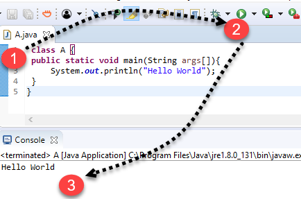 Step 7) If you copy and paste the same code in IDE like Eclipse the compiling and execution is done with the click of a button Using IDE is convenient and improves your efficiency but since you are learning Java, we recommend you stick to notepad.