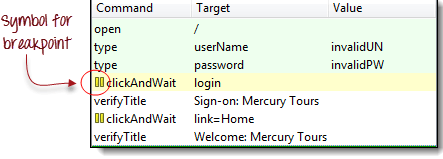 After clicking "Step." The "clickAndWait | login" line is run and pauses to the next command (verifyTitle | Sign-on: Mercury Tours). Notice that the next line is paused even though there is no breakpoint there. This is the main purpose of the Step feature - it executes the succeeding commands one at a time to give you more time to inspect the outcome after each step. |