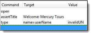| Step 6 Notice that the User Name text box does not have an ID, but it has a NAME attribute. We shall, therefore, use its NAME as the locator. Copy the NAME value and paste it onto the Target field in Selenium IDE. Still in the Target text box, prefix "userName" with "name=", indicating that Selenium IDE should target an element whose NAME attribute is "userName." Type "invalidUN" in the Value text box of Selenium IDE. Your test script should now look like the image below. We are done with the third command. Note: Instead of invalidUN, you may enter any other text string. But Selenium IDE is case sensitive, and you type values/attributes exactly like in the application. |