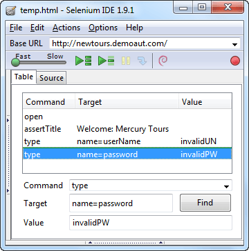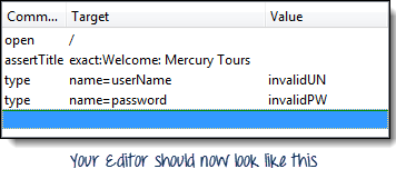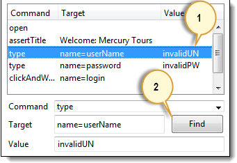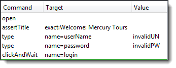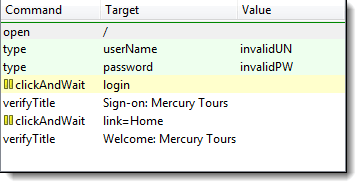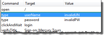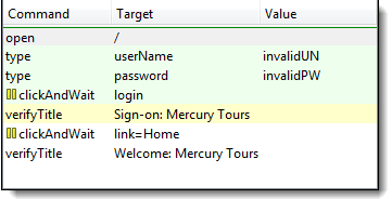 Step 1. Make sure that your browser is on the Mercury Tours homepage. Click on the command you wish to execute. In this example, click on the "type | userName | invalidUN" line.