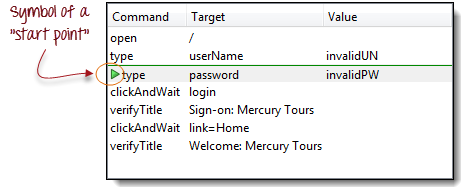 In the example above, playback will start on the third line (type | password | invalidPW). You can only have one start point in a single test script.