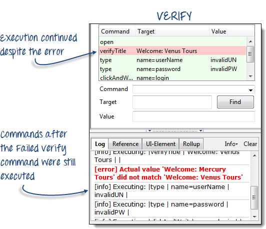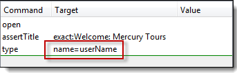 Executing commands this way is highly dependent on the page that Firefox is currently displaying. This means that if you try the example above with the Google homepage displayed instead of Mercury Tours', then your step will fail because there is no text box with a "userName" attribute within Google's homepage.