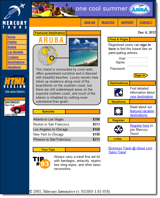 We will use the Mercury Tours website as our web application under test. It is an online flight reservation system that contains all the elements we need for this tutorial. Its URL is http://demo.gtupapers.com/test/newtours/, and this will be our Base URL.