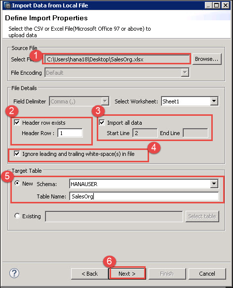 Exiting – If the table exist in SAP HANA, then choose this option. Select Schema name and Table. Data will be appended to end of the table.