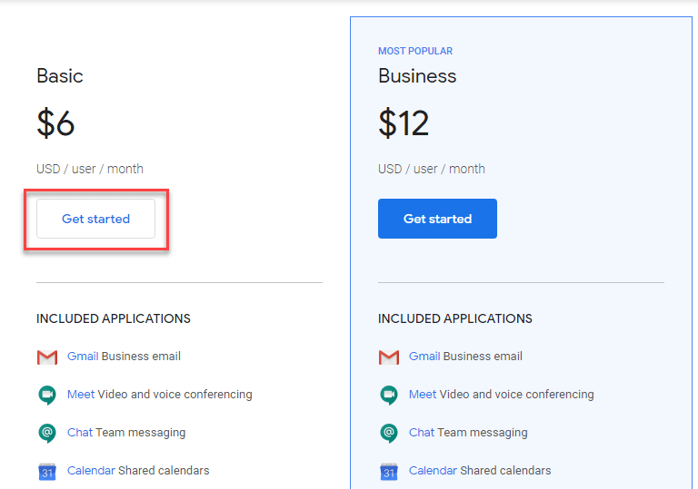 Click on "Get started" button. The per month fee is $6 per user.