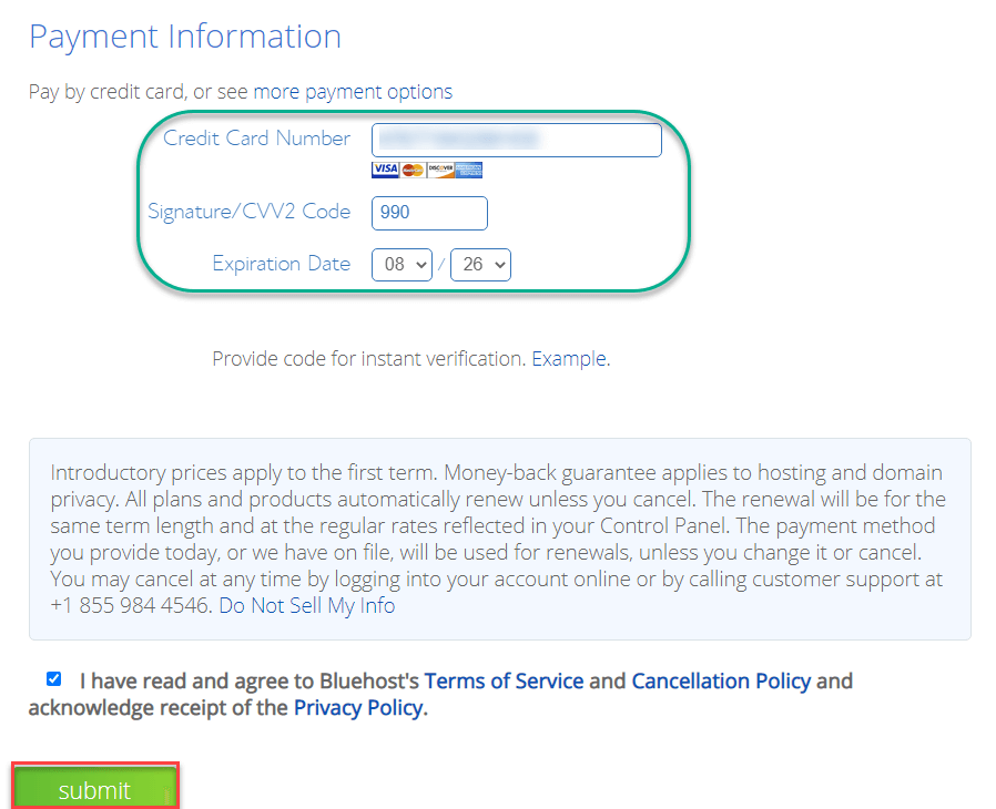 Enter the payment information and click on the submit button.