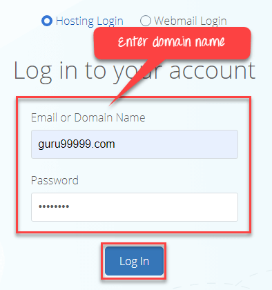At the Bluehost login link, Enter domain name and password, then click on Log In button