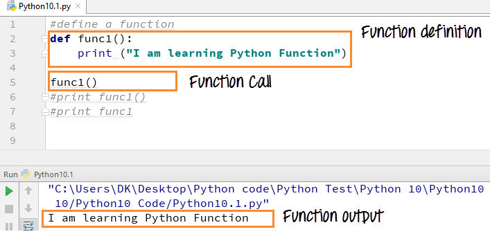 Let us define a function by using the command " def func1():" and call the function. The output of the function will be "I am learning Python function".