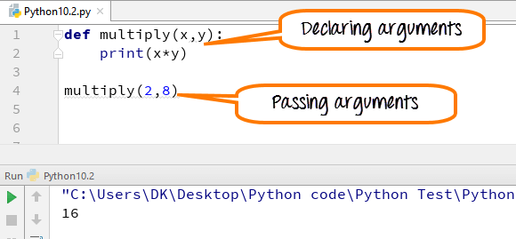Step 1) Arguments are declared in the function definition. While calling the function, you can pass the values for that args as shown below