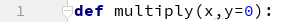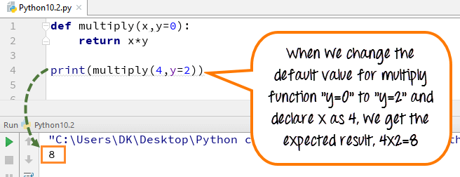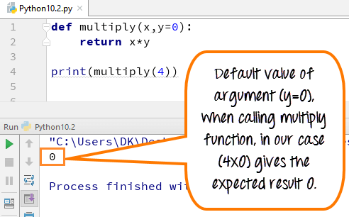 Example: x has no default values. Default values of y=0. When we supply only one argument while calling multiply function, Python assigns the supplied value to x while keeping the value of y=0. Hence the multiply of x*y=0