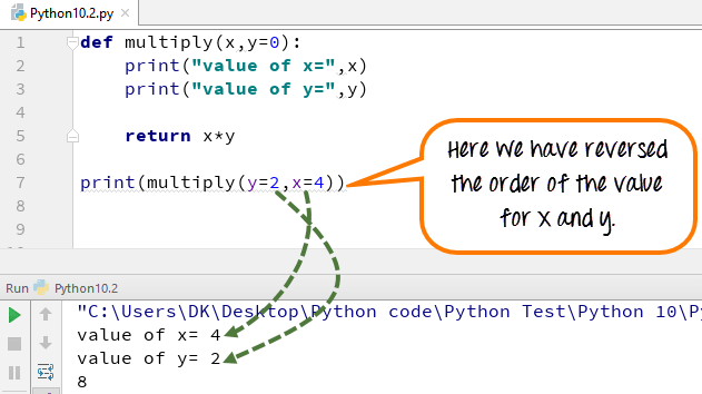 Step 4) You can also change the order in which the arguments can be passed in Python. Here we have reversed the order of the value x and y to x=4 and y=2.