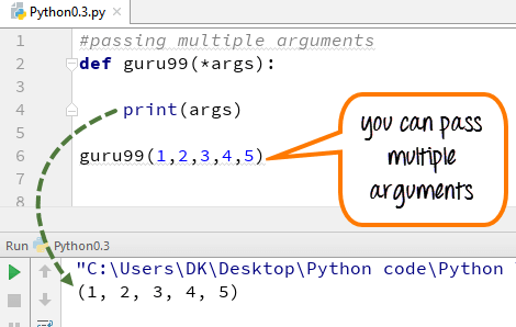 Example: We declared multiple args as number (1,2,3,4,5) when we call the (*args) function; it prints out the output as (1,2,3,4,5)