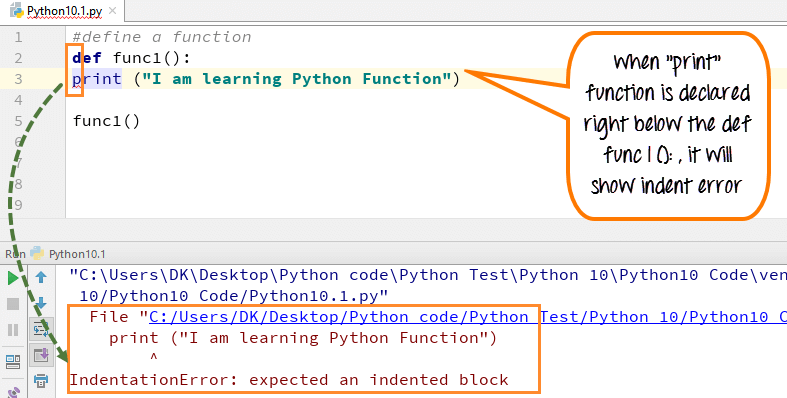 Python follows a particular style of indentation to define the code, since Python functions don't have any explicit begin or end like curly braces to indicate the start and stop for the function, they have to rely on this indentation. Here we take a simple example with "print" command. When we write "print" function right below the def func 1 (): It will show an "indentation error: expected an indented block".