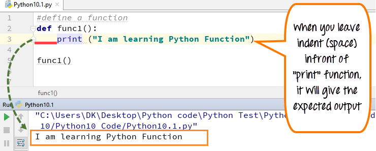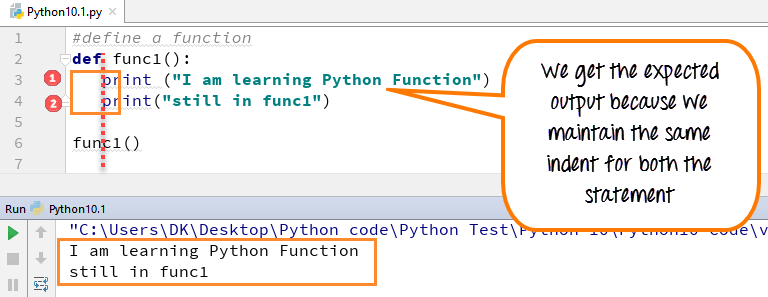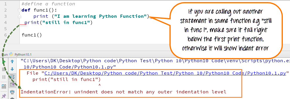 It is also necessary that while declaring indentation, you have to maintain the same indent for the rest of your code. For example, in below screen shot when we call another statement "still in func1" and when it is not declared right below the first print statement it will show an indentation error "unindent does not match any other indentation level."