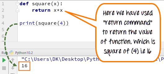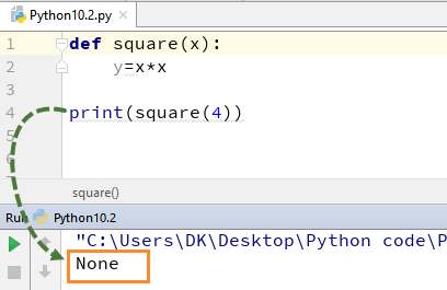Step 1) Here - we see when function is not "return". For example, we want the square of 4, and it should give answer "16" when the code is executed. Which it gives when we simply use "print x*x" code, but when you call function "print square" it gives "None" as an output. This is because when you call the function, recursion does not happen and fall off the end of the function. Python returns "None" for failing off the end of the function.