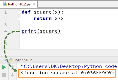 Step 4) Functions in Python are themselves an object, and an object has some value. We will here see how Python treats an object. When you run the command "print square" it returns the value of the object. Since we have not passed any argument, we don't have any specific function to run over here it returns a default value (0x021B2D30) which is the location of the object. In practical Python program, you probably won't ever need to do this.