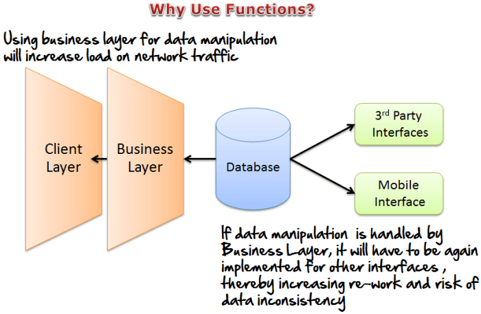 Another reason why we should consider using MySQL functions is the fact that it can help reducing network traffic in client/server applications. Business Layer will only need to make call to the stored functions without the need manipulate data .On average, the use of functions can help greatly improve overall system performance.
