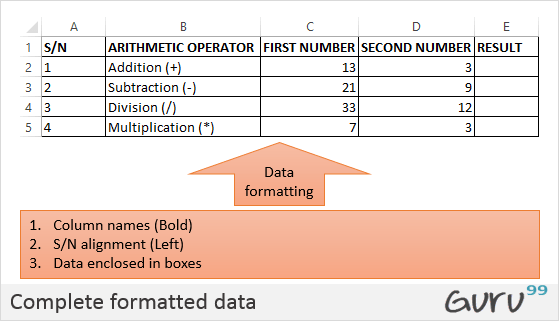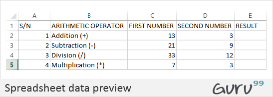In this tutorial, we are going to perform basic arithmetic operations i.e. addition, subtraction, division and multiplication. The following table shows the data that we will work with and the results that we should expect.