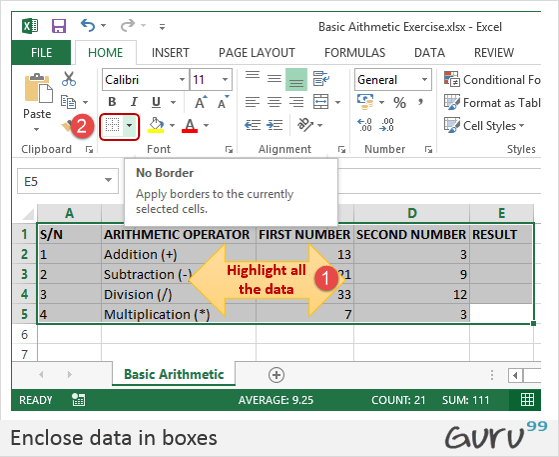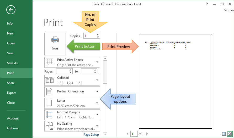 In this article, we have learnt how to perform basic arithmetic operations using Excel, Formatting data, How to Setting the print area and printing (Print View).