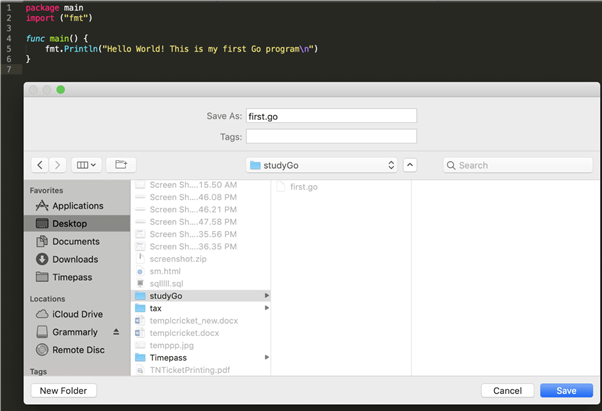 Create a folder called studyGo. In this Go language tutorial, we will create our go programs inside this folder. Go files are created with the extension .go. You can run Go programs using the syntax