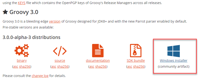 Step 2) Go to http://groovy-lang.org/download.html and click installer.