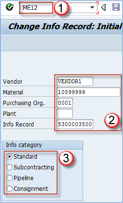 We said that the transaction used to create info record is code ME11. When we need to change the info record we can use code ME12 t-code, and for display only we should use code ME13, just as SAP standards are.