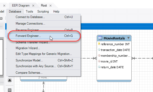 2. Click on the database menu. Select forward engineer