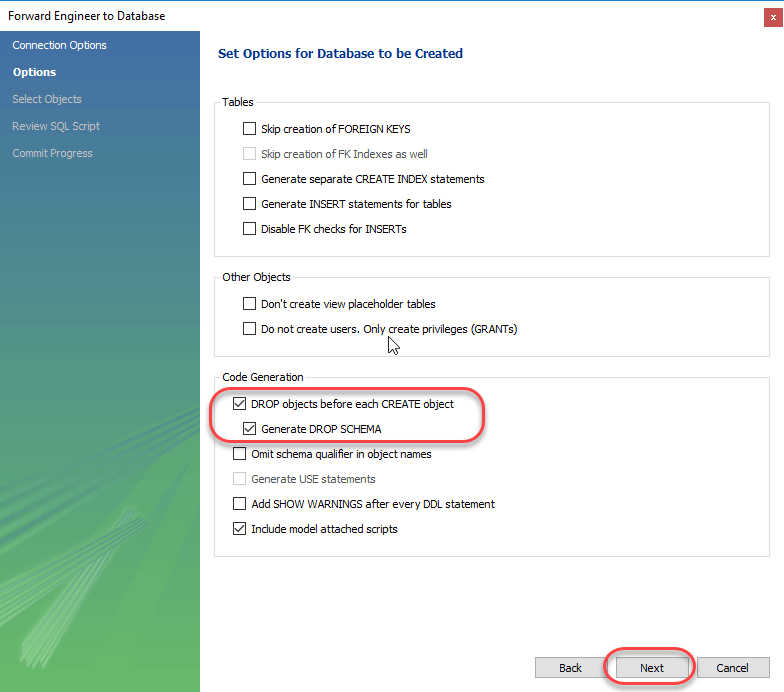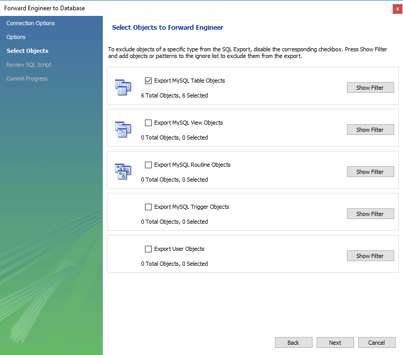 5. The next screen shows the summary of objects in our EER diagram. Our MyFlix DB has 5 tables. Keep the selections default and click Next.