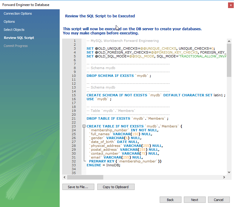 6.. The window shown below appears. This window allows you to preview the SQL script to create our database. We can save the scripts to a *.sql" file or copy the scripts to the clipboard. Click on next button