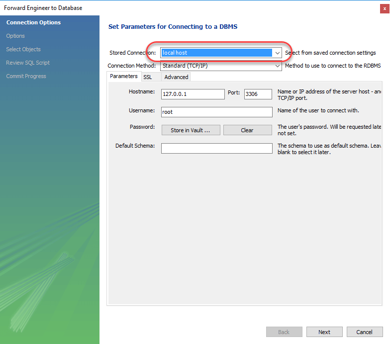 3. The next window, allows you to connect to an instance of MySQL server. Click on the stored connection drop down list and select local host. Click Execute