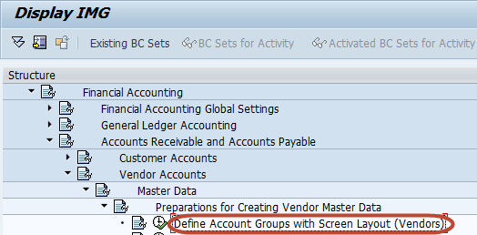 Step 3) In the next screen, 'Display IMG' Select the menu path Financial Accounting ->Accounts Receivable and Accounts Payable ->Vendor Accounts -> Master Data ->Preparations for Creating Vendor Master Data->Define Account Groups with Screen Layout(Vendors)