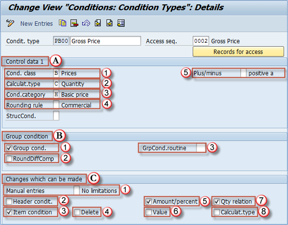 First section of the screen contains condition type PB00, description, and access sequence used for condition determination.